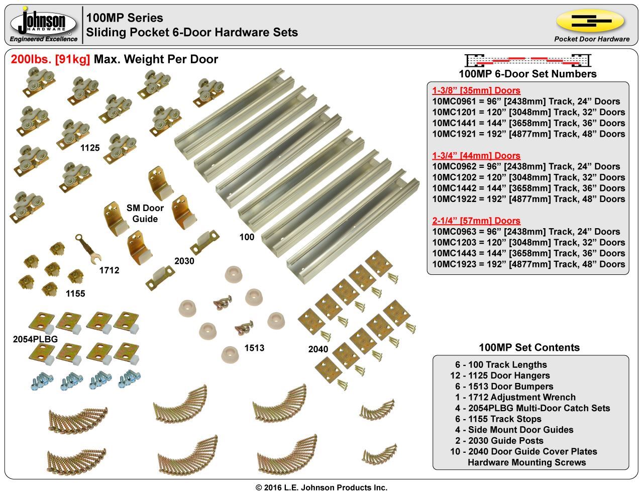 The 100MP is one of the finest medium to heavy duty sliding door systems made. The 100MP is designed to carry heavy solid core doors in both residential and commercial applications where quality counts and trouble-free long life operation is required. The heavy gauge convex rail box track is extruded to the most precise specification, and the fully adjustable guaranteed jump proof tricycle ball bearing hangers glide effortlessly with feather touch operation. Heavy gauge steel components are zinc trivalent plated for a quality appearance.