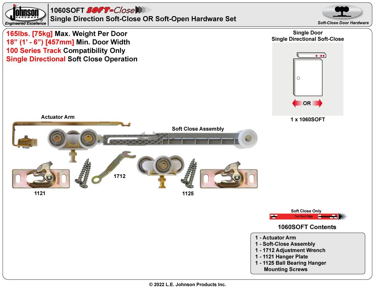 1 Direction Soft Close KitSingle Direction Soft Operation 165lbs. [75kg] Max. Door Weight 100, 134F, 138F, 2610F Series Track Compatibility 1500, 1560, 1562, 2710 Series Pocket Door Frame Compatibility