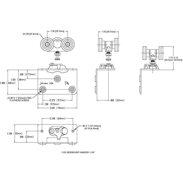 1-3/4" [44mm] Door Thickness Only200lbs [91kg] Weight capacity1" [25mm] Wheel diameterNylon Encapsulated Ball Bearing WheelSide Mount Hanger PlateCommercial GradeCompatible with 100, 134F Series Track Only Manufacturer part number: 1128