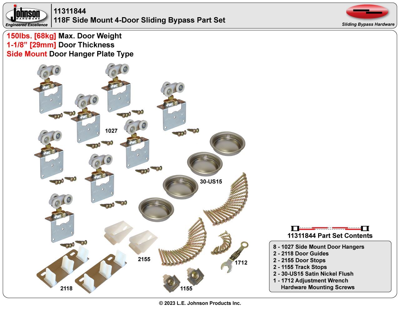 150lbs [68kg] Max Weight Per Door1-1/8" [29mm] Door Thickness Only111 or 118F Series Johnson Track Compatibility OnlySide Mount Ball Bearing Wheel Hanger TypeCommercial Grade Top Hung Sliding Door Hardware Manufacturer part number: 11311844