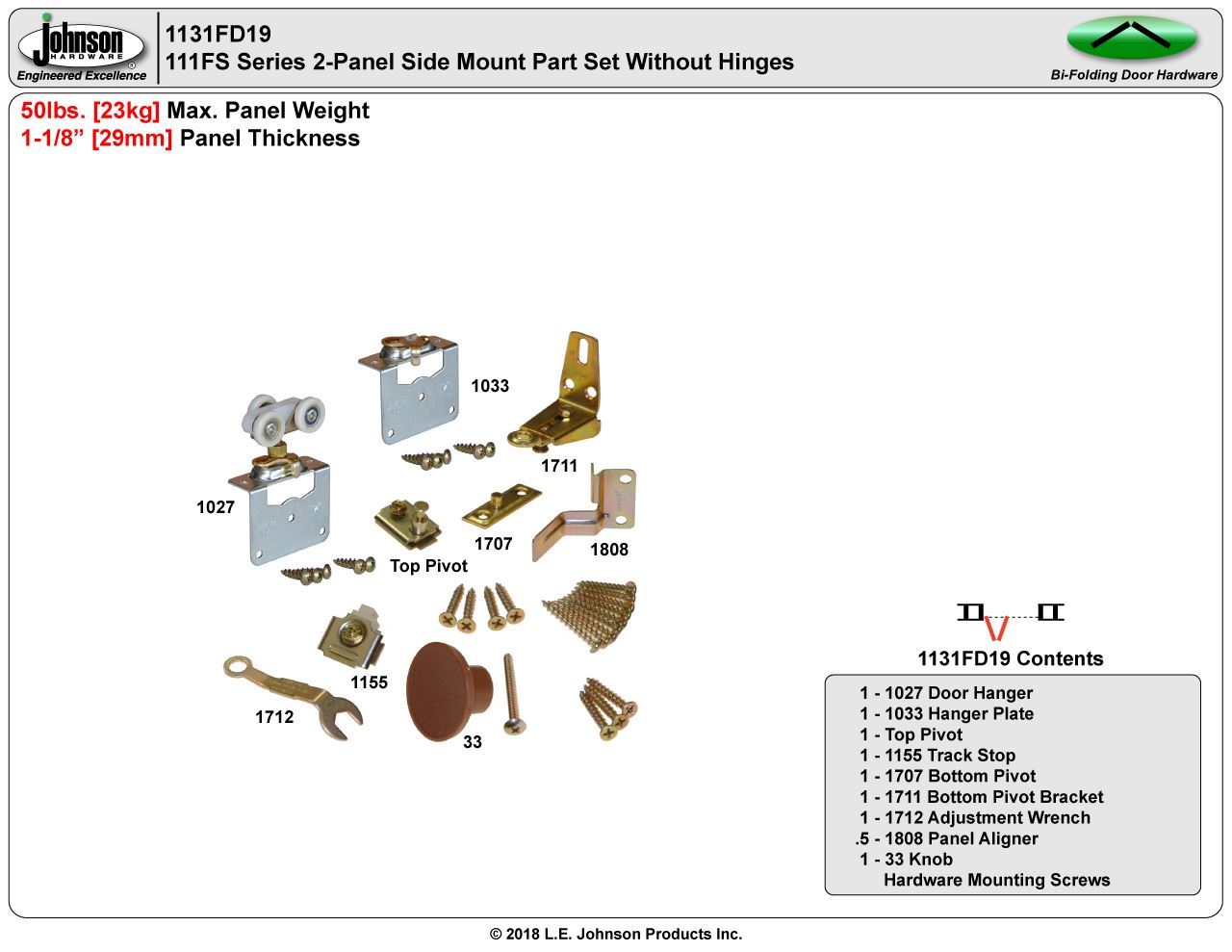1131FD19 2-Panel Side Mount Part Set WO/Hinges, 1-1/8" [29mm] Panels