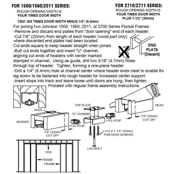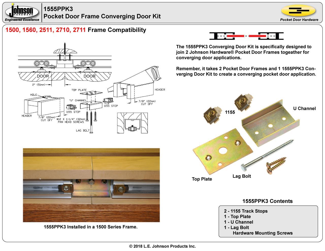 The 1555PPK3 Converging Door Kit connects 2 pocket door frame headers together allowing for 2 door (converging) pocket door installations.
