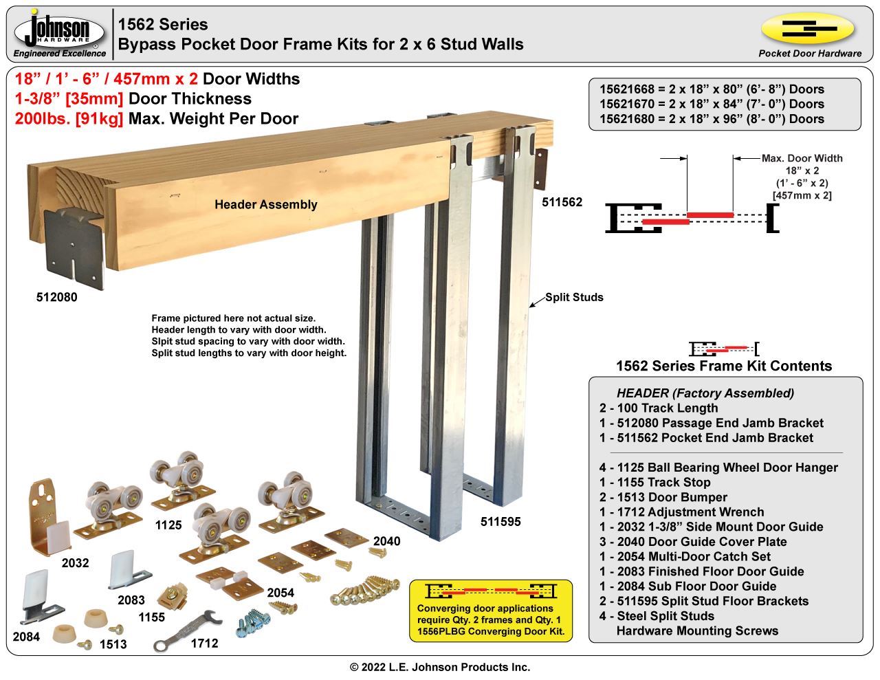 Converging Door Kit for 1562 Series Bypass Pocket Door Frame1562 Compatible Frame Series The 1556PLBG Converging Door Kit joins 2 1562 Bypass Pocket Door Frame Headers together allowing for 2 door (converging) pocket door installations.
