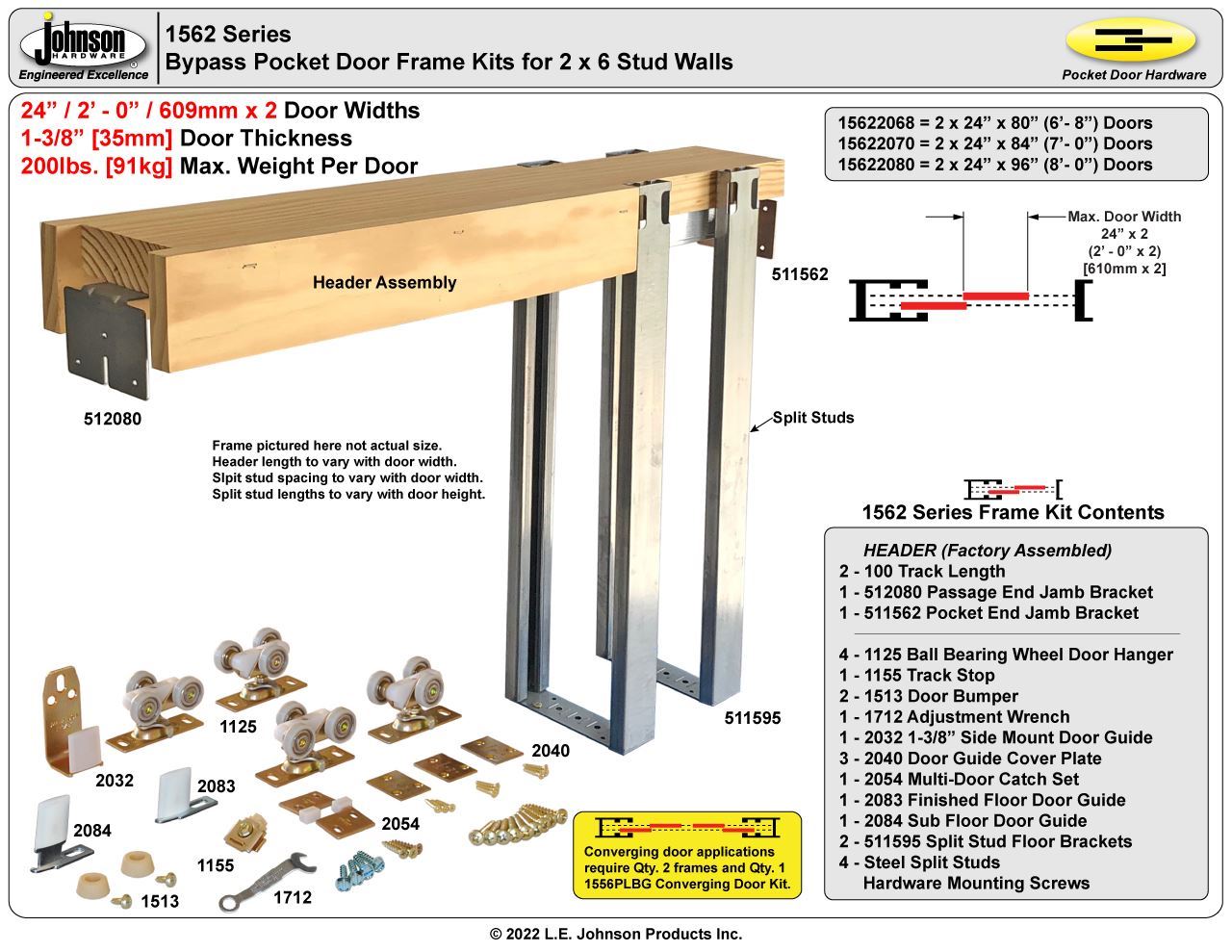 Converging Door Kit for 1562 Series Bypass Pocket Door Frame1562 Compatible Frame Series The 1556PLBG Converging Door Kit joins 2 1562 Bypass Pocket Door Frame Headers together allowing for 2 door (converging) pocket door installations.