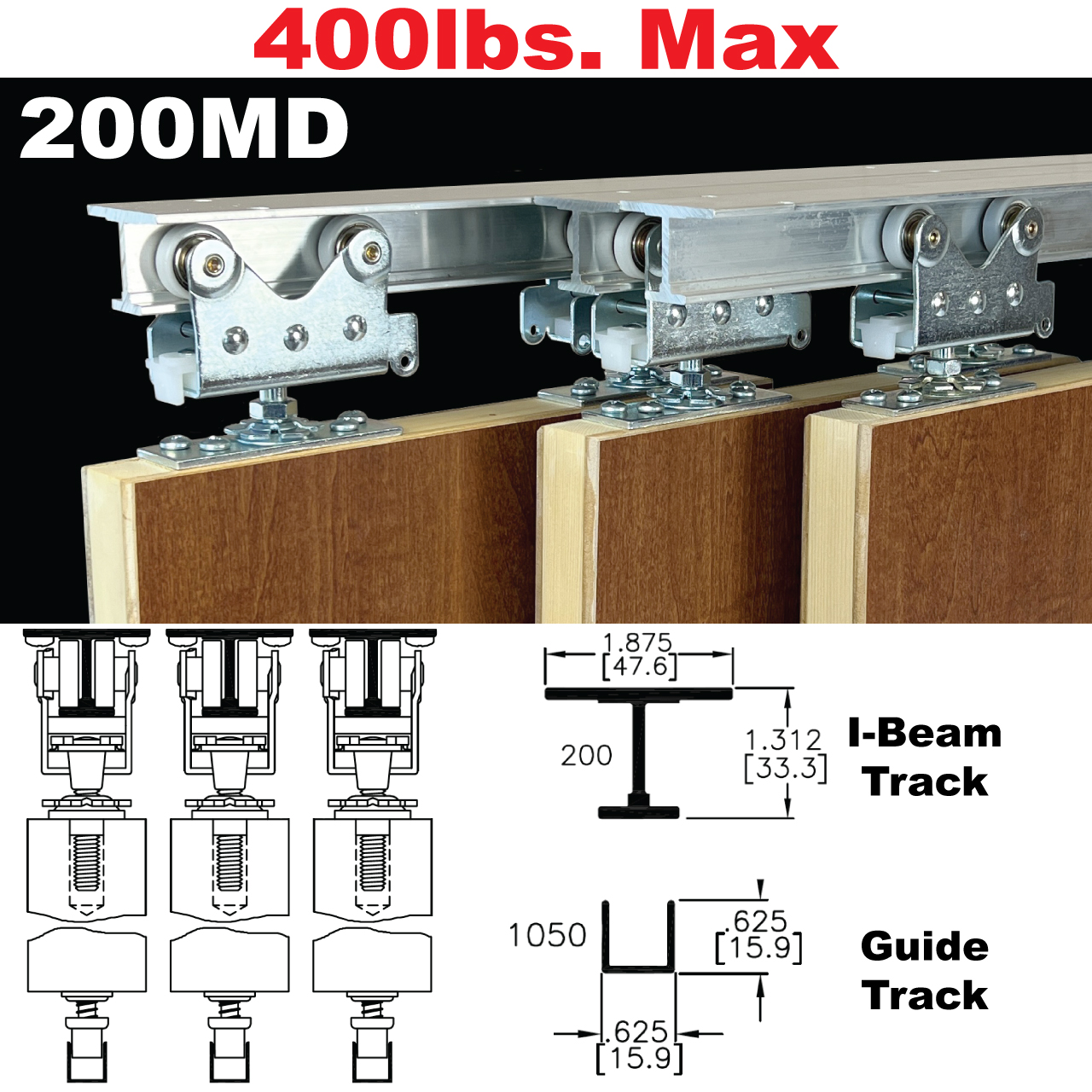400lbs [181kg] Max Weight Per Door6-1/2" [165mm] Min Wall Structure Thickness*1-1/8" [29mm] Min Door Thickness192" (16') [4877mm] Max. Track LengthCommercial Grade Top Hung Sliding Door Hardware*Wall Structure Thickness Varies With Door Thickness