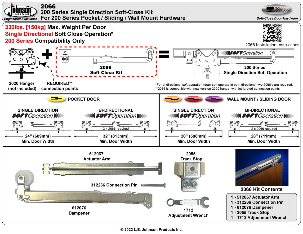 The 2066 Soft-Close Kit contains a single soft-close mechanism for single door, single direction soft operation. The 2066 is compatible with the 2020 Door Hanger (not included) which rides on the 200 Series I-Beam track. For bi-directional soft operation (door soft operates in both directions) two 2066 Soft-Close Kits are required.