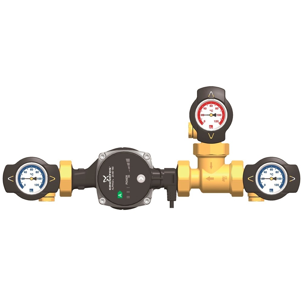 De PAW pompset is geschikt voor retourstroomverhoging en is uitgerust met een 3-weg menger en drie kogelkranen 1” IS (Inwendig Schroefdraad).
