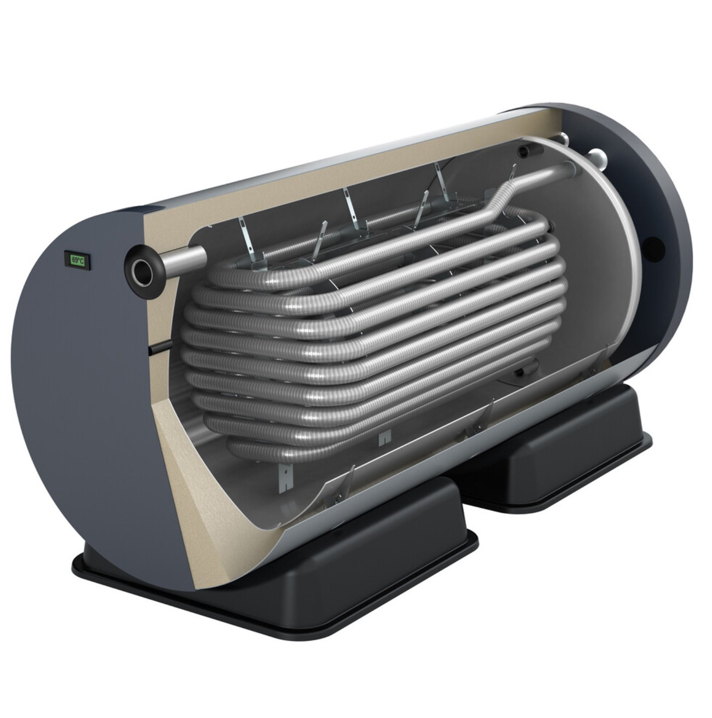 Horizontale buffervaten met tapwater-doorstroomspiraal en twee warmtewisselaars. Afmetingen van 120, 150, 200, 300, 400 en 500 liter.