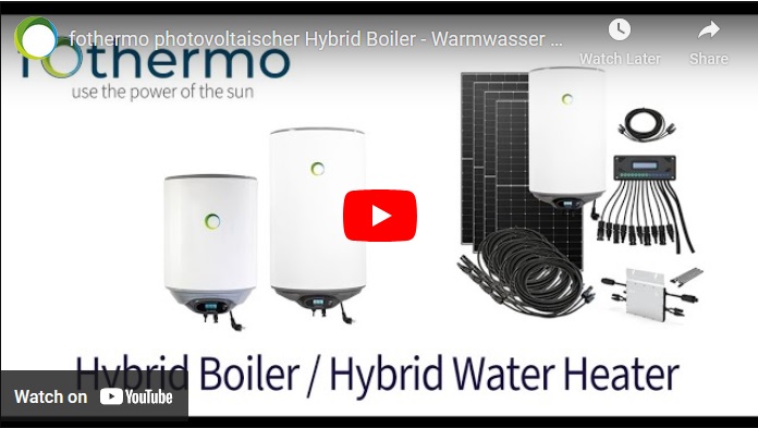 De fotovoltaïsche hybride boiler is de ideale oplossing voor een kosteneffectieve en duurzame warmwatervoorziening in uw woning. Warm water is goed voor 20-40% van het energieverbruik in een huishouden. Fothermo-boilers zijn de gemakkelijkste manier om de energie van de zon rechtstreeks te gebruiken. Eenmaal geïnstalleerd produceert de boiler gratis warm water met behulp van de kracht van de zon. Met zijn hoge prestaties dient de fotovoltaïsche boiler als vervanging voor een klassieke elektrische boiler. De automatische naverwarming via het elektriciteitsnet bij slecht weer zorgt voor voldoende warm water, ook op dagen zonder zonnestraling.
