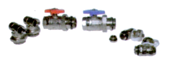 2 x kogelkraan 1", 2 × eindstuk 1" × 1/2", 2 × luchter 1/2", 2 × stop LV, en 2 × vul en aftapkraan. Complete set voor het aansluiten van de radiatorverdeler.