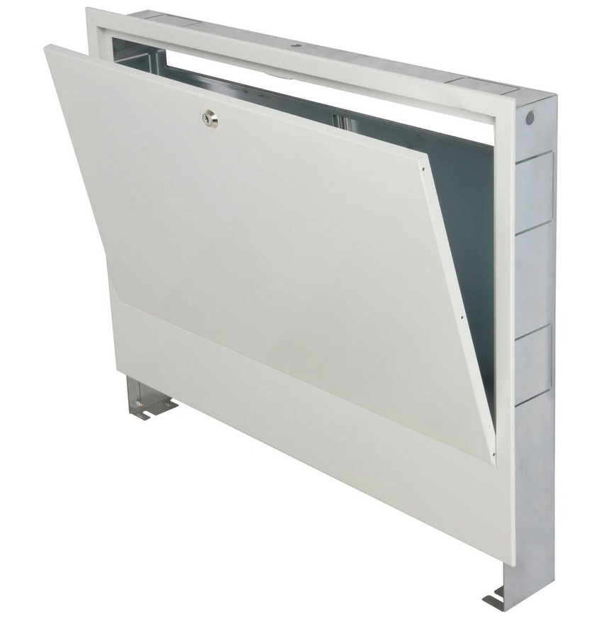 Opbouw verdelerkast voor verwarmingscircuitverdelers. Met insteekslot en invoermogelijkheid via onderzijde of achterwand. Voor nette montage tegen de muur.